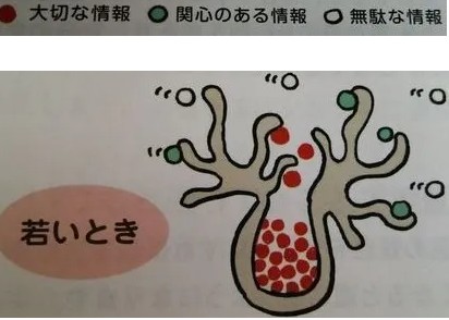 イソギンチャクの手が活発にはたらき、自分にとって大切な情報を選んで「記憶のツボ」に入れ、普段は思い出さなくても、必要な時に取り出すことが出来ます。