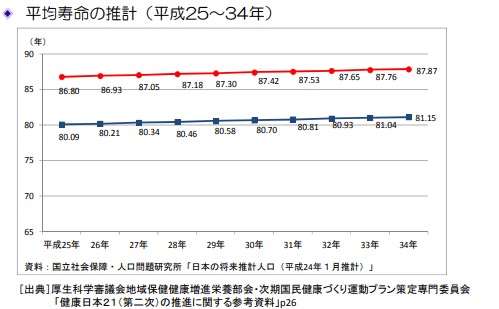 よれば、平成25年から平成34年にかけて、平均寿命は男性では80.09年から81.15年
