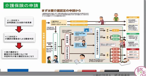 認定調査員等による心身の状況に関する調節、主治医意見書、要介護認定基準時間の算出状態の維持・改善可能性の評価(コンピューターによる推計)、介護認定審査会による審査。